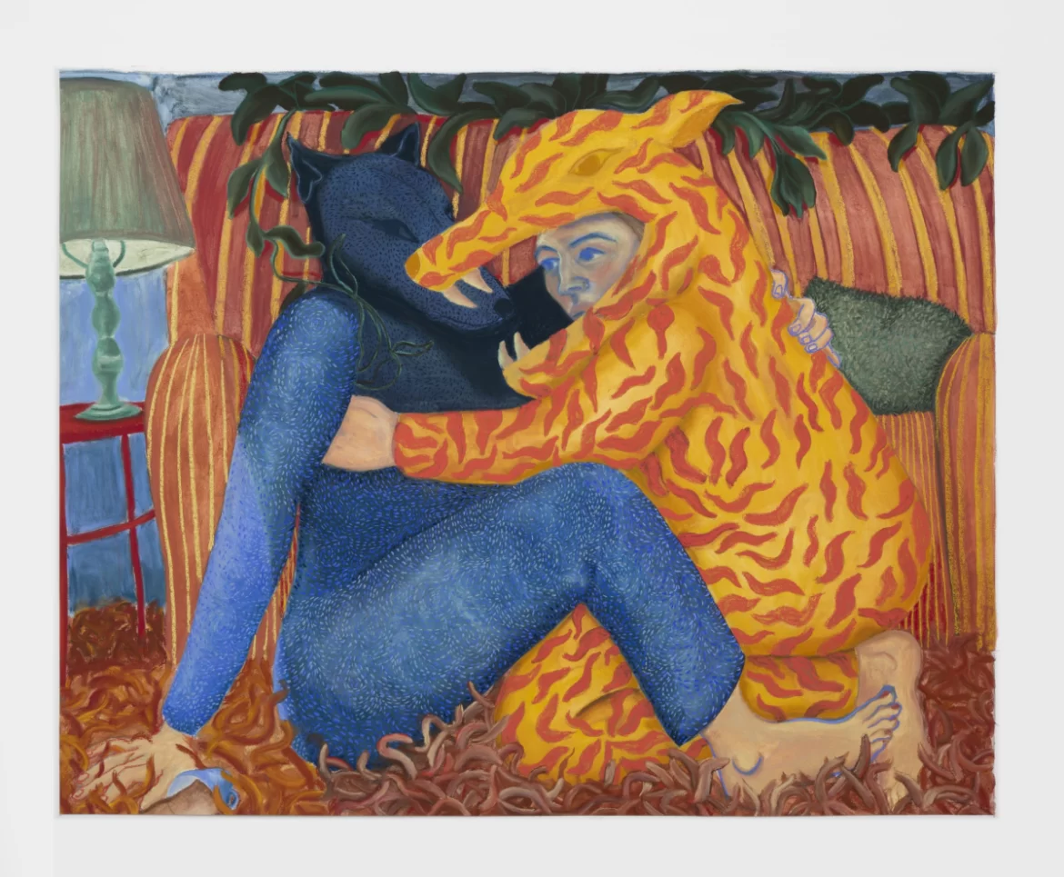 This month, September Gallery in Kinderhook presents two “overlapping” exhibitions that celebrate female pleasure and play. Humans of course are animals is a solo show of bright, psychological paintings and drawings — with a touch of surrealist magic — by United Kingdom-based Nell Brookfield, while the group show In the pale moonlight includes a range of entertaining works on paper, paintings, fabric works, as well as a video by 10 women artists, that unabashedly revel in fun. Prime examples are Sarah Lee’s “A puppy’s first birthday tea” (2021), a spiritualist-inflected painting depicting the titular scene, and Allyson Mellberg-Taylor’s “We Can All Learn To Be Still” (2024), which features a splayed-out woman with a cat resting on her back as three yellow snails slither around. Taken together, both shows conjure flirtatious visions of frolicking via themes such as self-love, existential pondering, and cheeky adoration among friends and animals.
