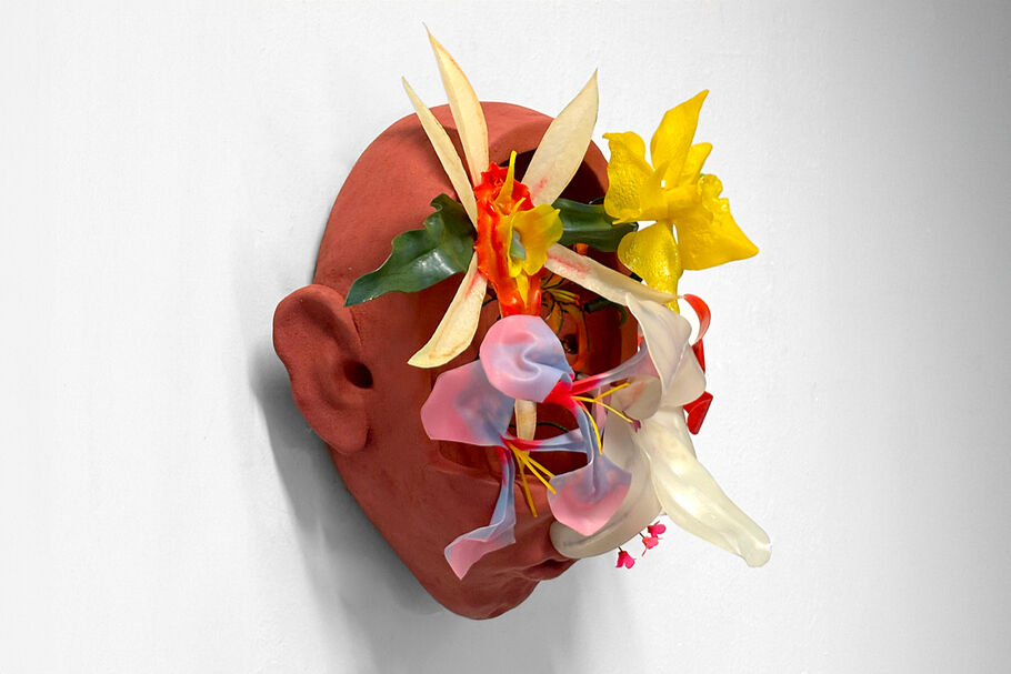 Brazilian sculptor Pedro Wirz collaborated with a material scientist to create adaptive, reusable polymers for this exhibition focused on reimagining our relationship to everyday materials as we confront the climate crisis. This series of sculptures experiments with new materials that can be reshaped and reconceived repeatedly, a statement about the need to address the disposable nature of our modern culture, including in the art world. In reimagining materiality through the use of these cutting-edge polymers, Wirz draws on iconic mythological imagery, including the myth of Daphne, who transformed into a tree to escape the god Apollo. In The Boy with Many Friends (2024), a mask-like burnt clay sculpture adorned with bright flowers, this metamorphosis is on full view.