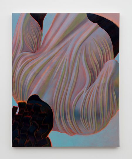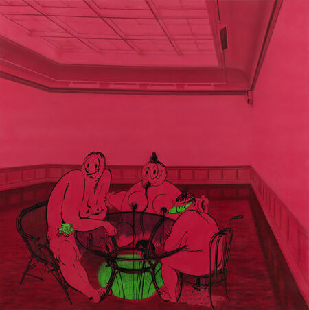 This intimate moment of connection is a recurring motif in Gardner’s work, where entwined figures convey both comfort and vulnerability. For example, in All I trust is my trust fund(2024), an adult figure holds a child dressed in coral-colored clothing, capturing the emotional strength and fragility that define both Gardner’s exploration of human connection and his own experience as a father.