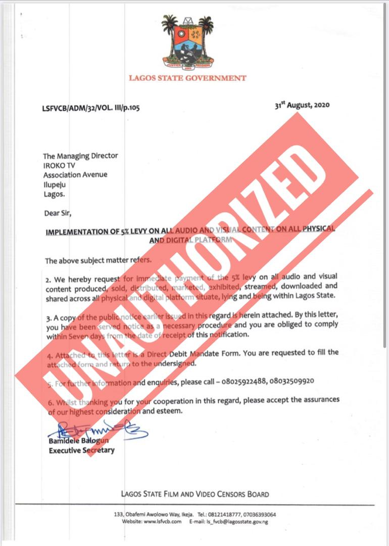 In the notice, dated August 31 and addressed to iROKOtv’s Managing Director, Jason Njoku, which he shared via twitter, the LSFVCB had requested “the payment of the five percent levy on all audio and visual contents produced, sold, distributed, marketed, exhibited, streamed, downloaded and shared across all physical and digital platform situate lying and being within Lagos State.”