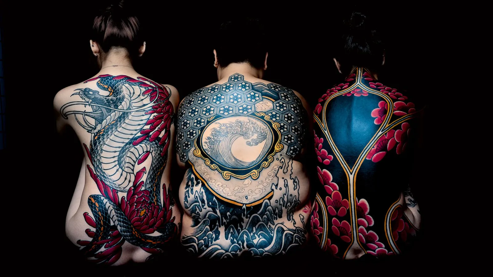 By contrast, the tattoo art of Ganji Bang is about overturning traditions. Bringing his Japanese heritage to his workplace in Los Angeles, Bang confronts and subverts Japanese folklore by doing the unthinkable, and inking his clients with yōkai, ghastly supernatural monsters feared to inhabit the body if tattooed on to the skin. Mokumokuren, all-seeing eyes and portents of a yōkai infestation, are a repeated motif, staring out – often in multiples – from fearsome creatures, or stacked up in layers as part of a complex pattern. Bang’s customers include the US rapper Post Malone, who commissioned a Japanese wave design for his left temple in 2018.