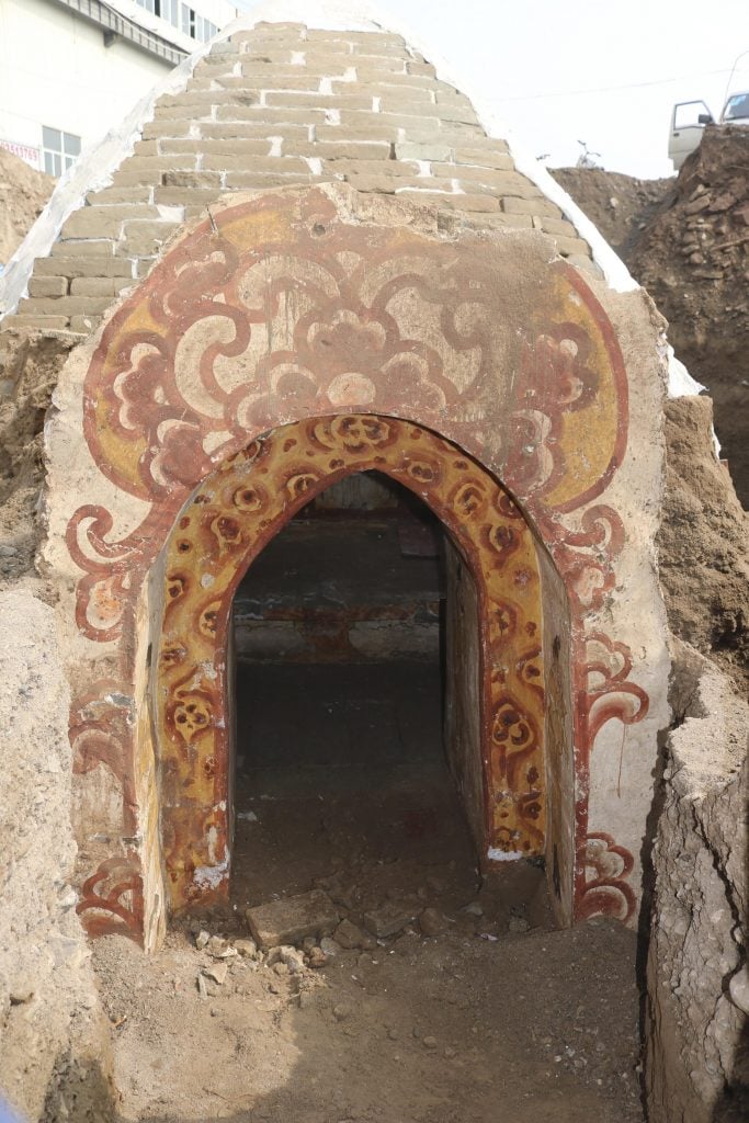 The brick tomb’s painted entrance. Photo courtesy of Jinyang Ancient City Research Institute.