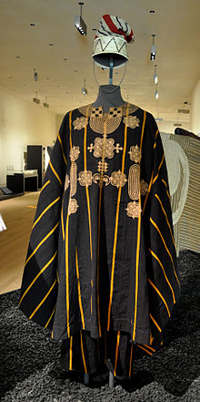Aso-oke is a type of handwoven, hand-dyed, or hand-printed cloth manufactured from a range of materials such as cotton, silk, and even lurex. The traditional method of manufacturing aso-oke begins with the dyeing of the foundation cloth with natural dyes, followed by weaving on a loom. The finished cloth is then embroidered with motifs using a supplemental weft thread known as “sanyan” or “alaari.”