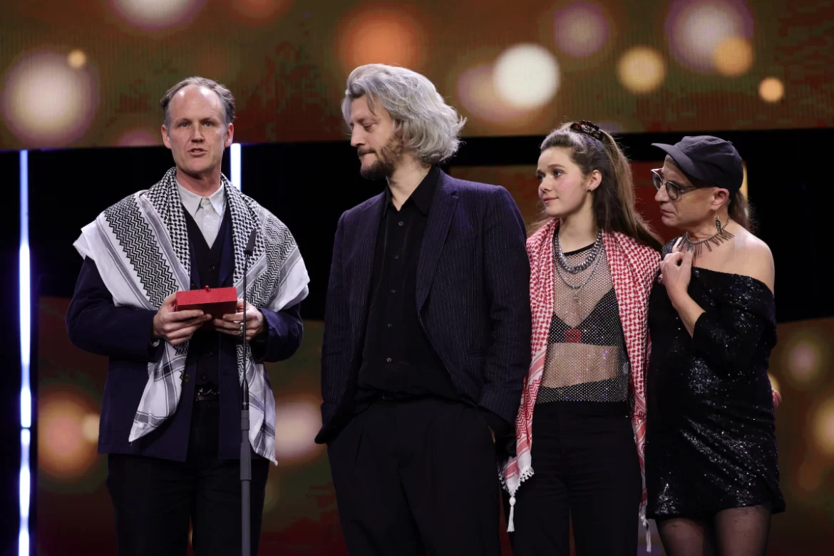During the festival’s closing ceremony on Saturday, February 24, Jewish-American filmmaker Eliza Hittman, American filmmaker Ben Russell (clad in a keffiyeh), and Berlin-based French filmmaker Guillaume Cailleau took the stage with statements in solidarity with Palestine.