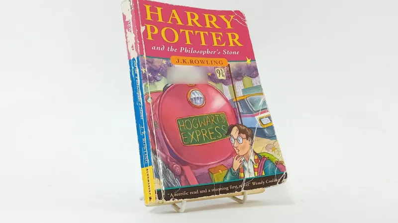 It has a series of distinctive features including the author’s name “Joanne Rowling” listed on the title page, the misspelling of “Philosopher’s” as “Philospher’s” on the back cover and the double printing of the words “1 wand” on page 53.