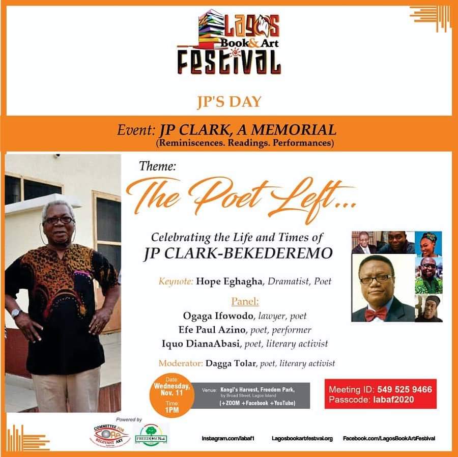 A memorial (of sort) for JP Clark has just ended at the Lagos Books & Arts Festival (LABAF, 22nd edition) which took place at Freedom Park, Lagos.