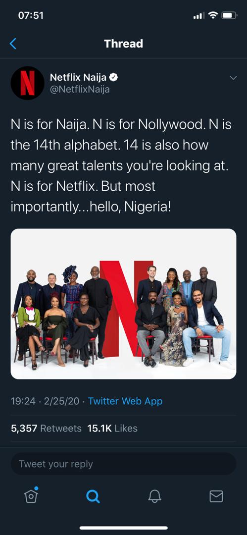 “N is for Naija. N is for Nollywood. N is the 14th alphabet. 14 is also how many great talents you’re looking at. N is for Netflix. But most importantly… hello, Nigeria!” read the account’s announcement tweet.