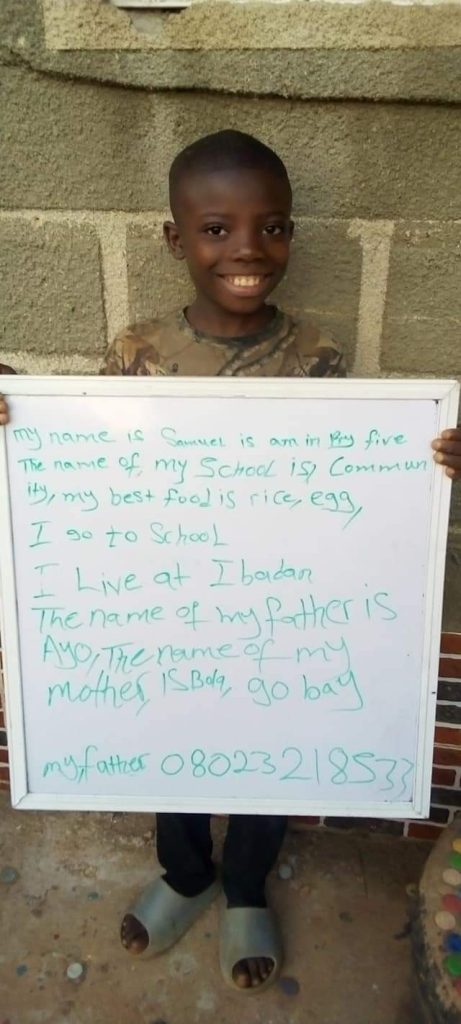 A few weeks back, Jumoke posted a message on social media to raise awareness on the plight of Samuel, a young out of school boy whose mother’s demise and his father’s unemployed state had kept him out of school for two years.