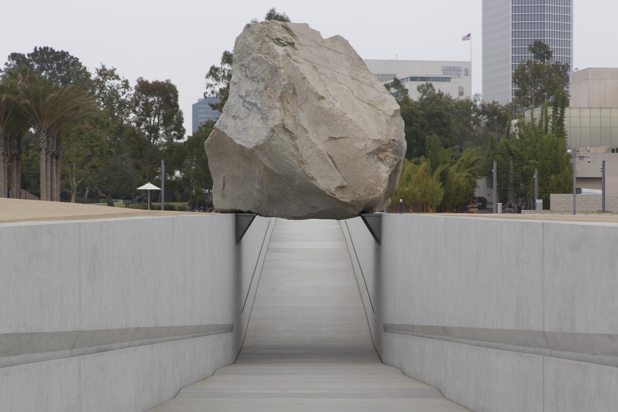 The artwork in question is Michael Heizer’s titanic sculpture Levitated Mass, which was unveiled at the Los Angeles County Museum of Art in 2012 after an epic 11-day journey from a quarry some 60 miles away. The piece consists of a granite boulder weighing some 340 tons and standing 21 feet high, perched on two small shelves so that it stands above a 456-foot-long, 15-foot-wide trench that gradually arrives under the boulder at 15 feet below ground level. It opened June 24, 2012 to massive crowds. It is one of the rare artworks to have an eponymous feature-length documentary devoted to it.