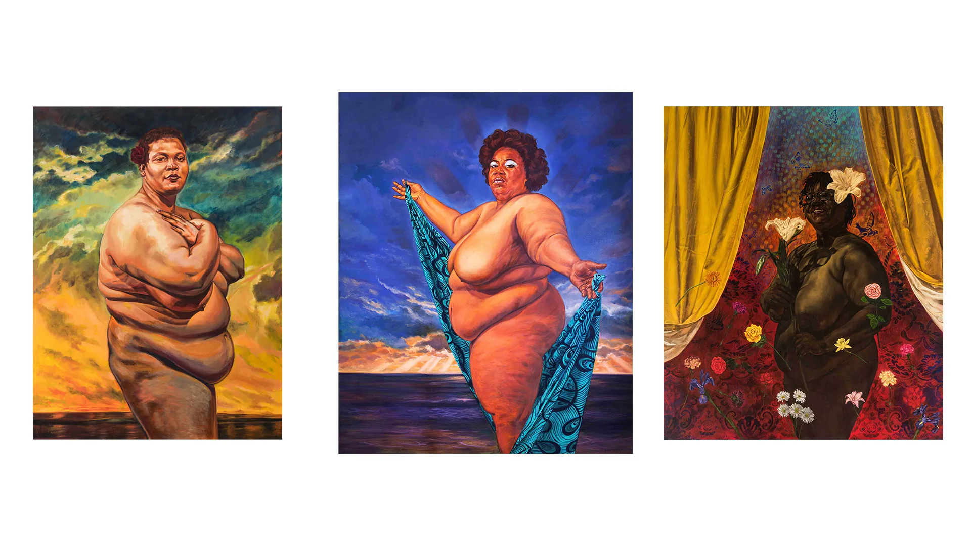As described in a SAMA announcement about the triptych, Rodríguez-Díaz’s paintings portray “nude women of color who do not conform to the idealized body type prevalent throughout Western art history,” with fulsome, fleshy bodies in proud stances.