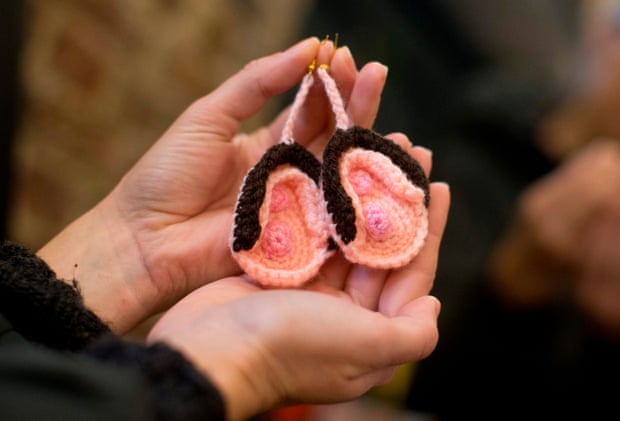 A visitor looks at a pair of crochet vulva earrings. Photograph: Isabel Infantes/AFP via Getty Images