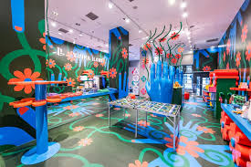 Now, Ilori’s work covers the Bloomingdale’s facade and window displays with bright blooms and psychedelic colors. Inside, Ilori takes over the “Carousel,” the store’s pop-up space, with his “Cherish Your Magic” installation. Animated, bright flowers and vines creep up the walls with oversized orange blooms popping out in 3-D, while massive blue sculptures of hands frame display tables.